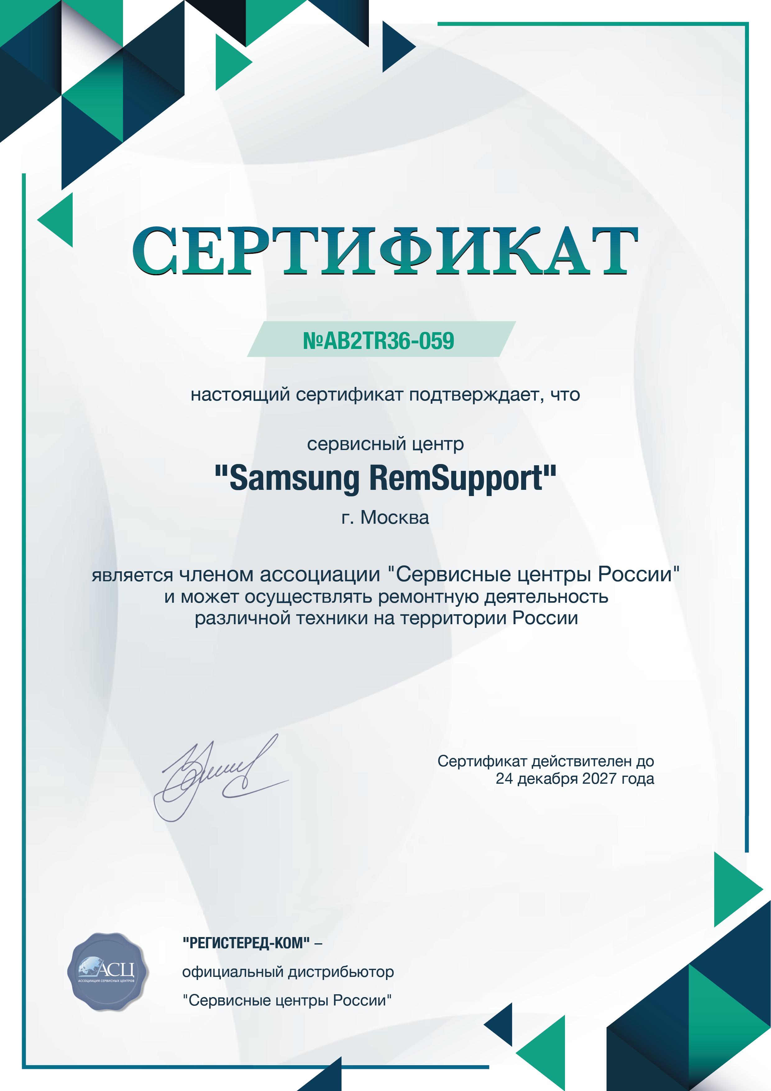 Ремонт техники Samsung в нашем сервисном центре выполняется на основании действующей сертификации и в строгом соответствии с техническими стандартами производителя. Документально подтвержденная квалификация позволяет проводить диагностику и восстановление смартфонов, планшетов, телевизоров и другой электроники бренда с соблюдением регламентов и требований к качеству работ.